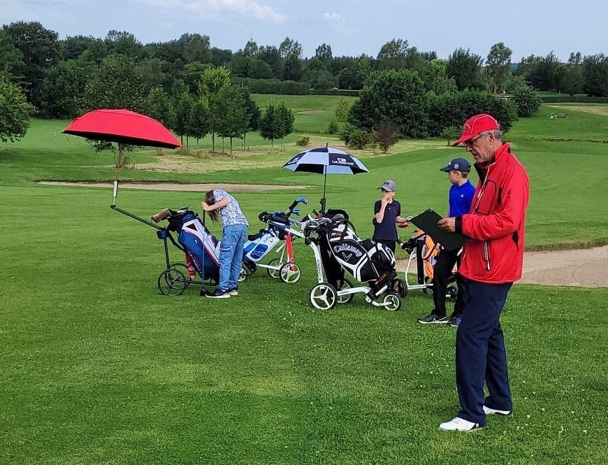 Gleich am Montag in der Früh ging’s los. Einige Teams mussten noch „bestimmt“ werden. Wie bei den Erwachsenen werden 3 x 9 Löcher gespielt, doch nicht an einem Tag, sondern jeweils an den ersten 3 Tagen des Camps eine Runde. die AK 12er spielten unter Begleitung (Zähler) von Grün, die AK 18 von Gelb/Rot und jeweils unisex Bewertung.